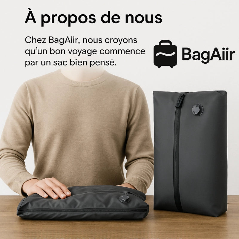 Nous plaçons la qualité, la simplicité et la durabilité au cœur de notre démarche. BagAiir, c’est la promesse d’un sac intelligent qui vous accompagne partout, que ce soit pour un voyage, une randonnée ou un simple rangement à la maison.